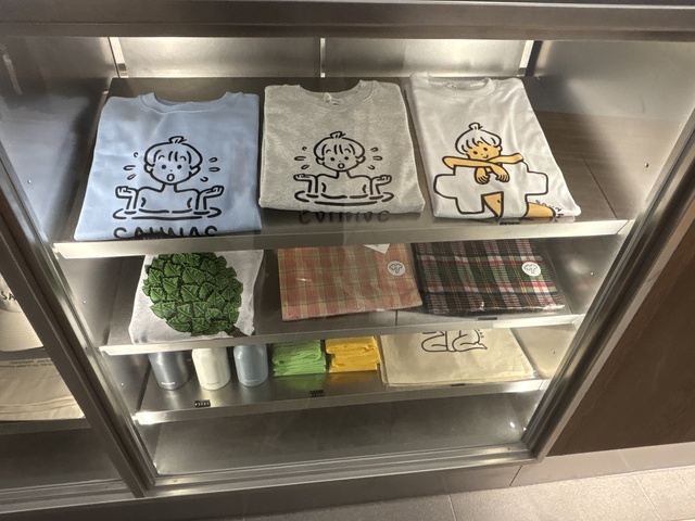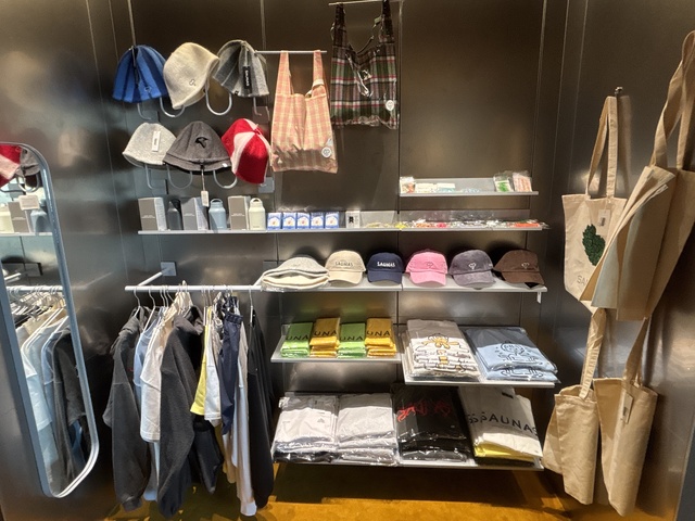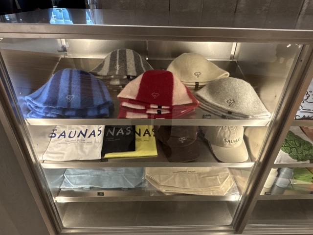 高輪SAUNASでは、可愛らしいデザインのTシャツやサウナハットなどのサウナグッズが売っていました。